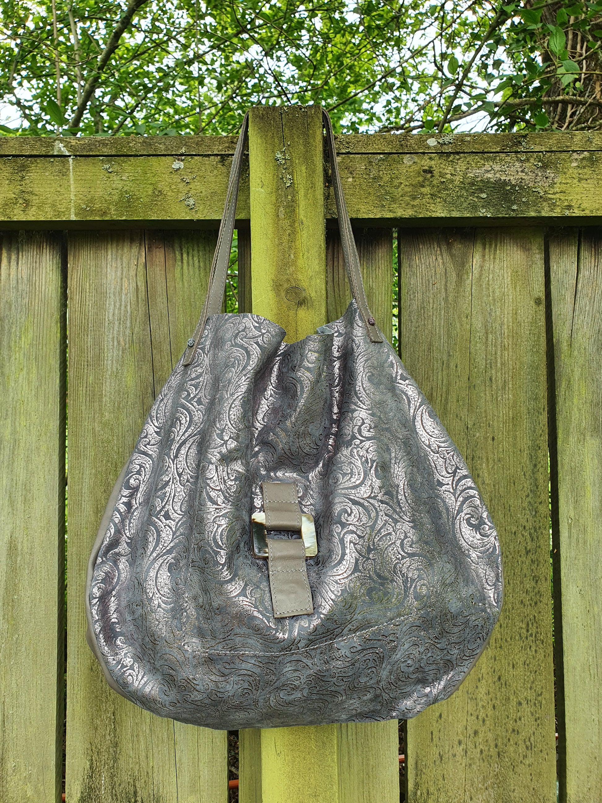 Oval shaped leather bag , 2 handles 60 cm, no lining, 1 inner pocket with zip and 1 extra matching pochette.