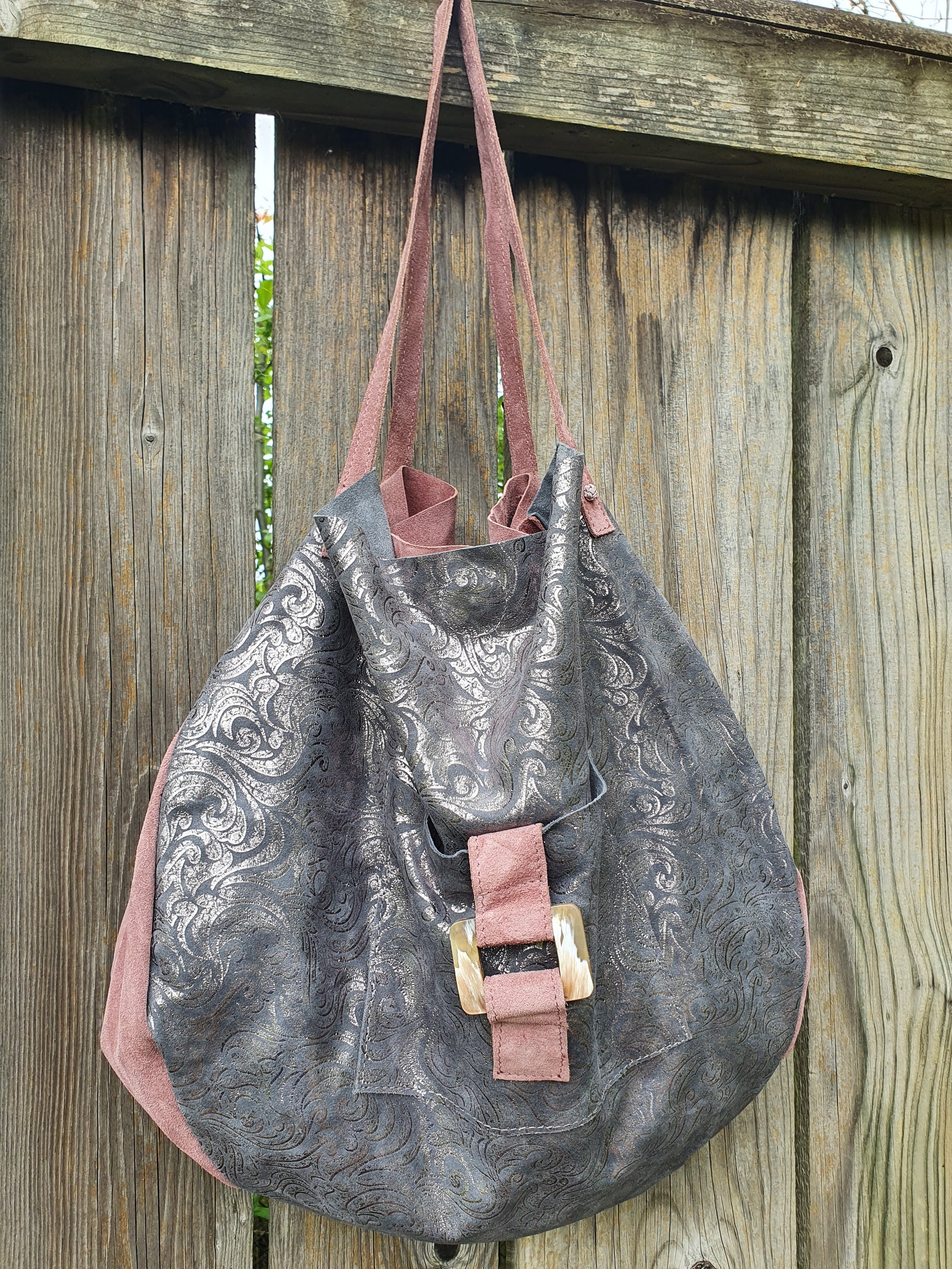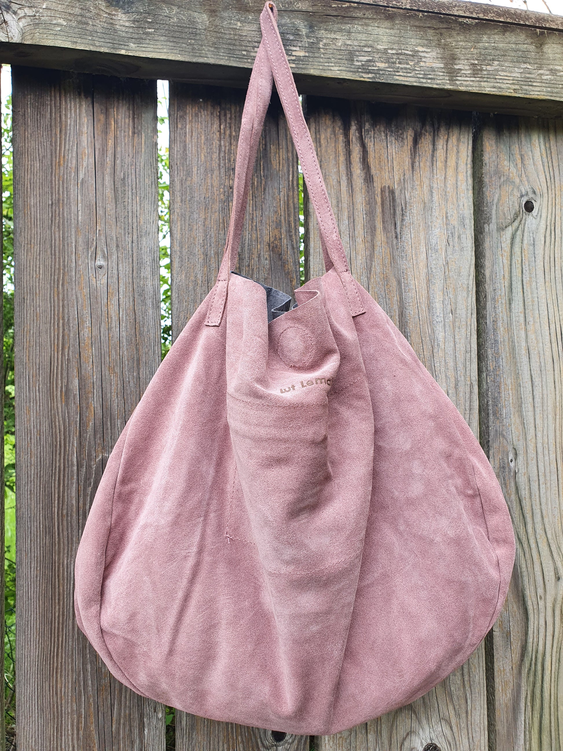 Oval shaped leather bag , 2 handles 60 cm, no lining, 1 inner pocket with zip and 1 extra matching pochette.