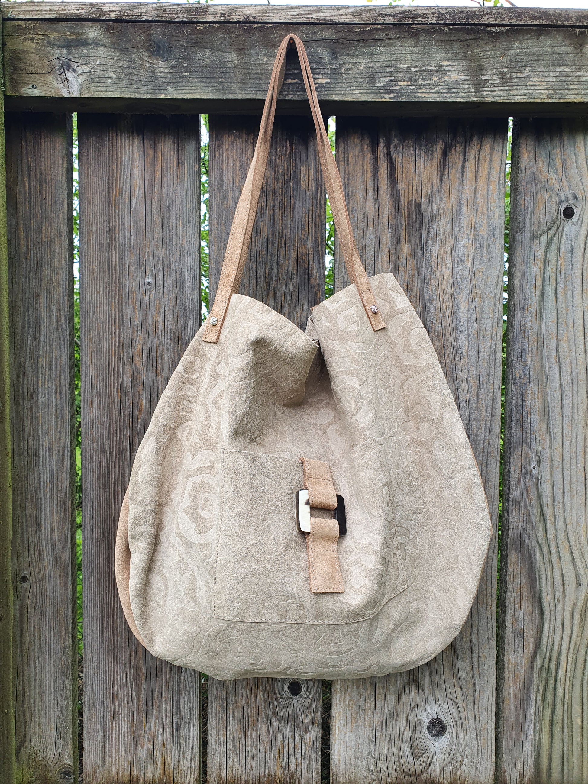 This bag has 2 sides beige suede flower print with beige suede at the sides.