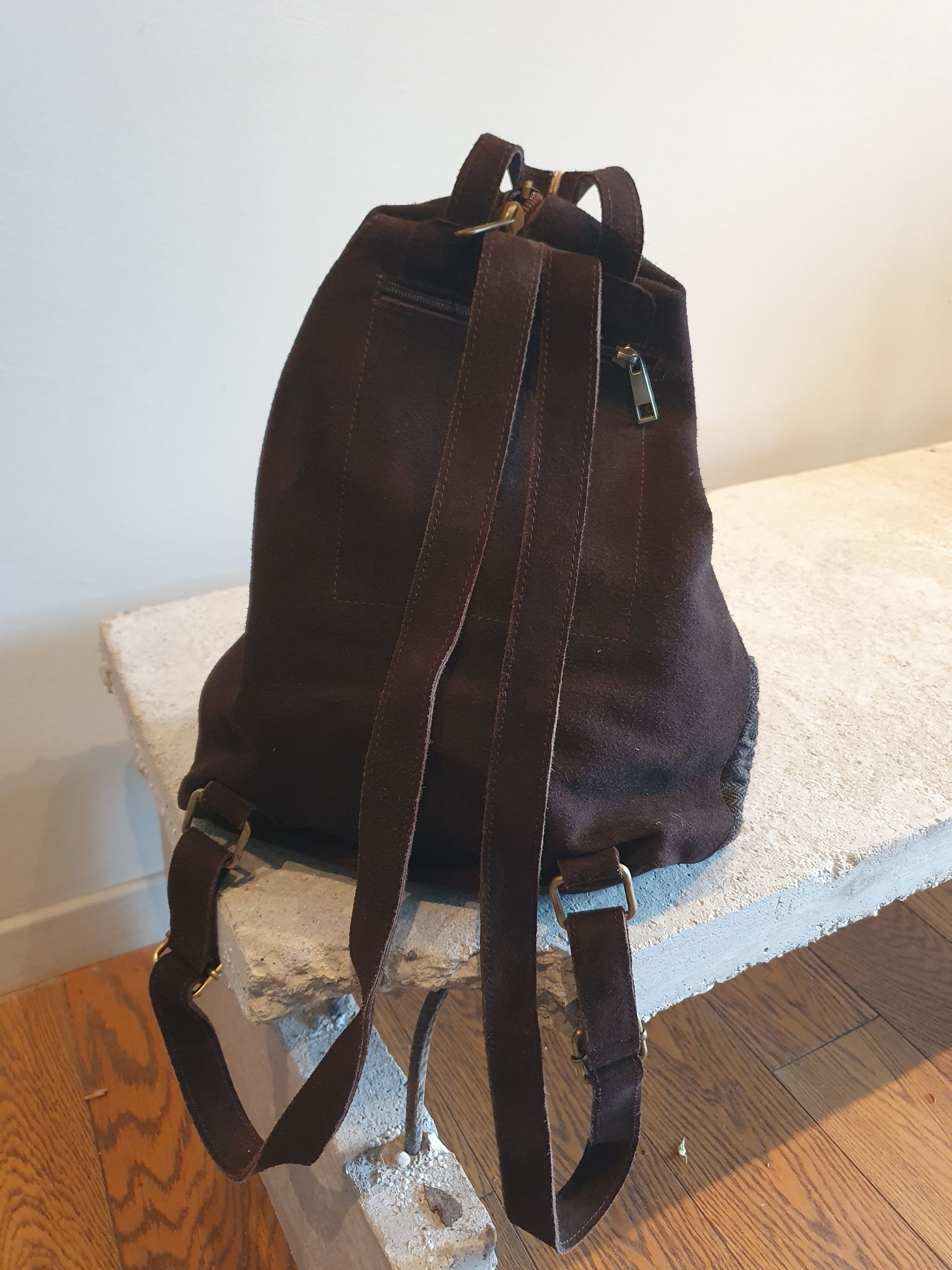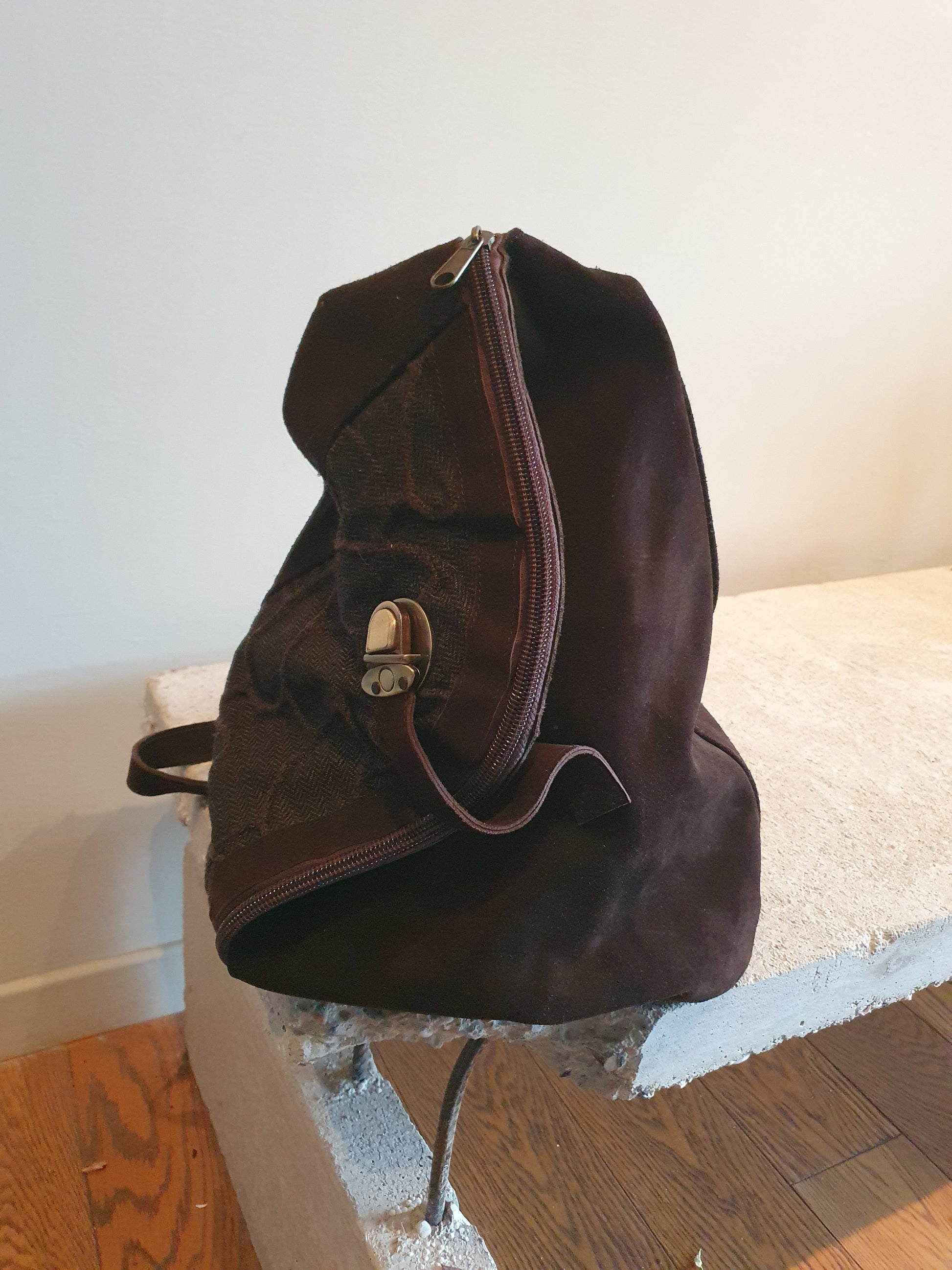 This backpack has a very original design. It is made out of leather combined with tweed fabric.