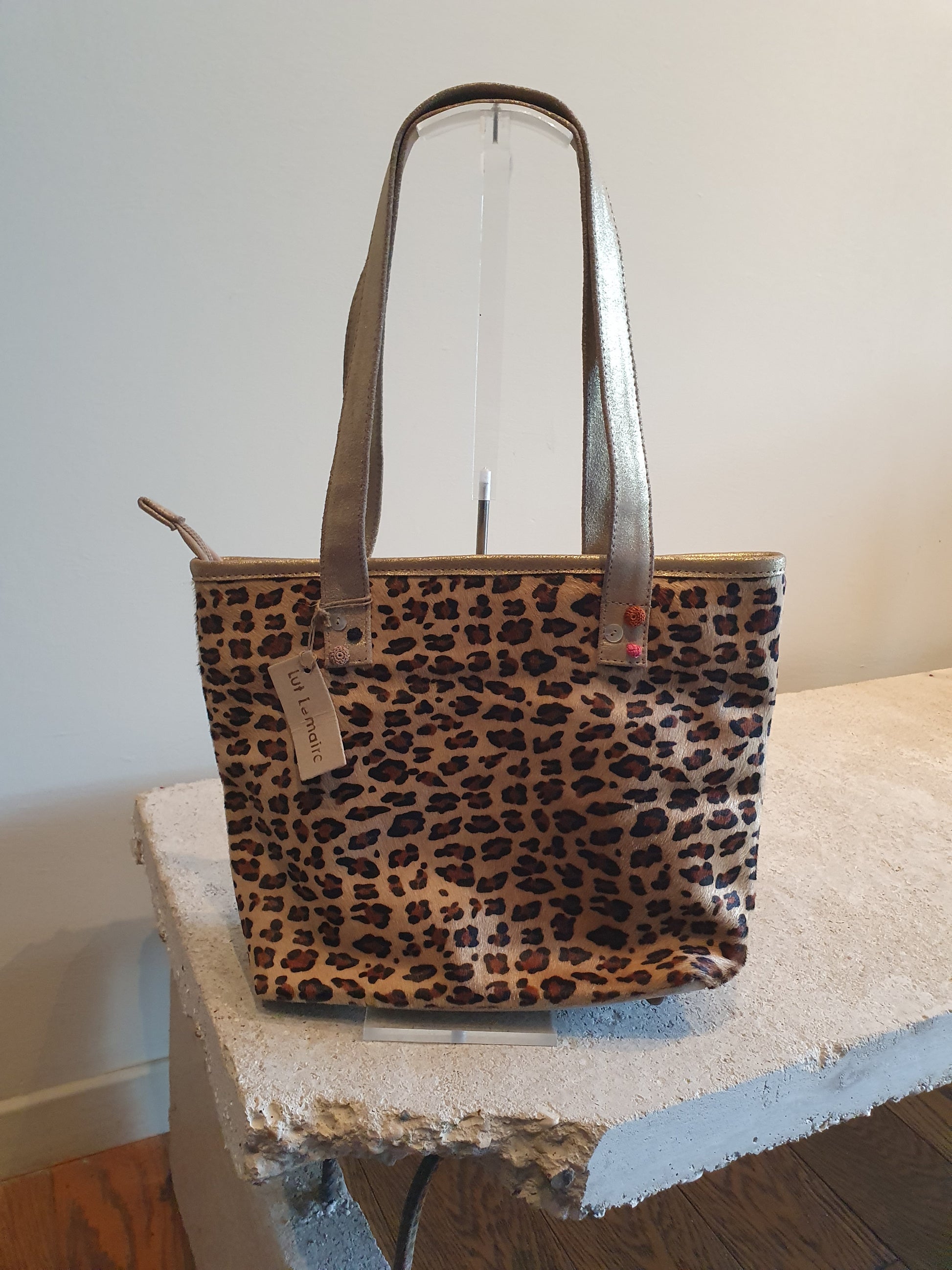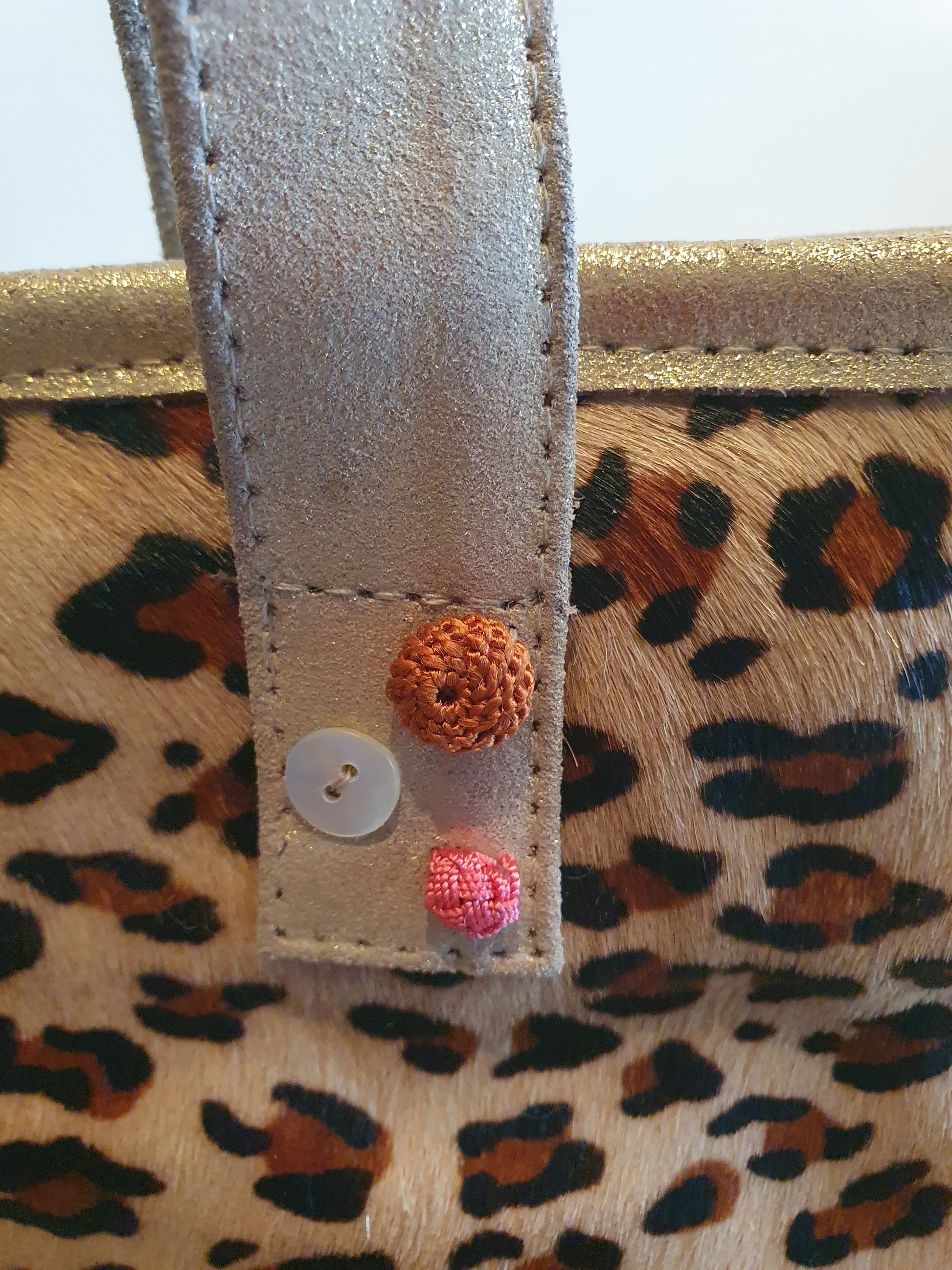 This cute little bag , but very practical, is made out of silver grey nubuck in combination with a front of leopard printed cow skin.