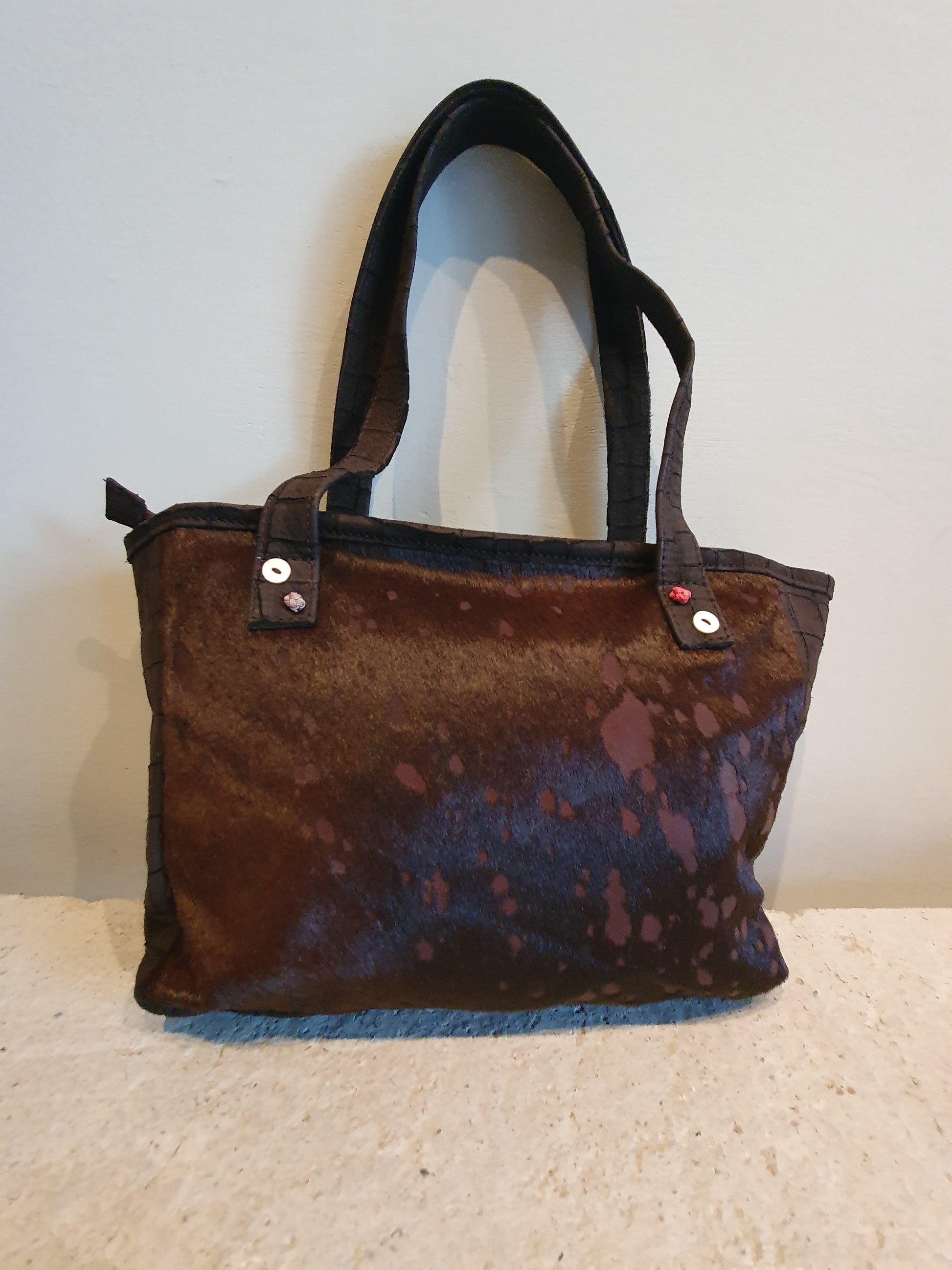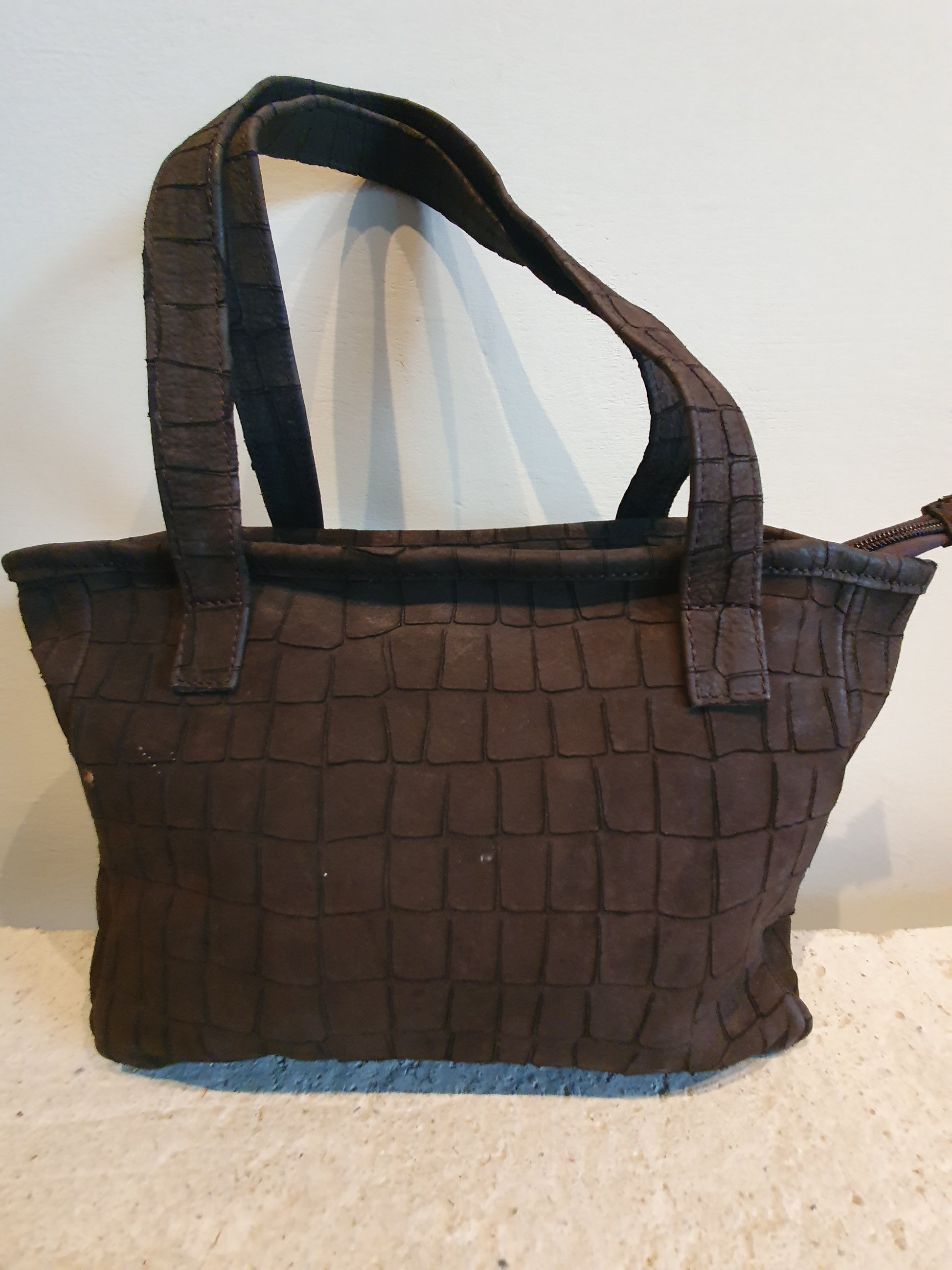 This cute little bag , but very practical, is made out brown checkered pattern nubuck in combination with a cow skin front.